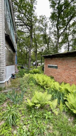 Окна выходят на лес. Есть полисадник, сарай с погребом и гараж с ямой.