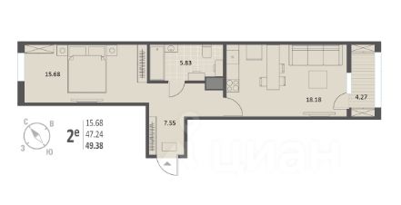 Общая площадь квартиры 49.38 кв.м. Жилая комната 15.68 кв.м. Кухня-гостиная 18.18 кв.м. Просторный совмещенный санузел 5.8 кв.м. Застекленная лоджия. Вид из окон - двор, улица Краснознаменная.