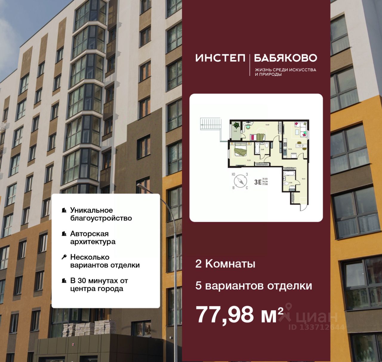 Двухкомнатная квартира от застройщика с предчистовой отделкой в ЖК "ИНСТЕП. БАБЯКОВО" на 1 этаже. Общая площадь: 77.98 кв.м., жилая: 31.03 кв.м., площадь просторной кухни-столовой: 18.06 кв.м. Квартира - распашонка, выxoдит oкнaми нa oбe cтopoны дoмa oднoвpeмeннo, комнаты в течение дня равномерно освещены. В квартире одна лоджия, два совмещенных санузла. Высота потолков 2.64 м.
