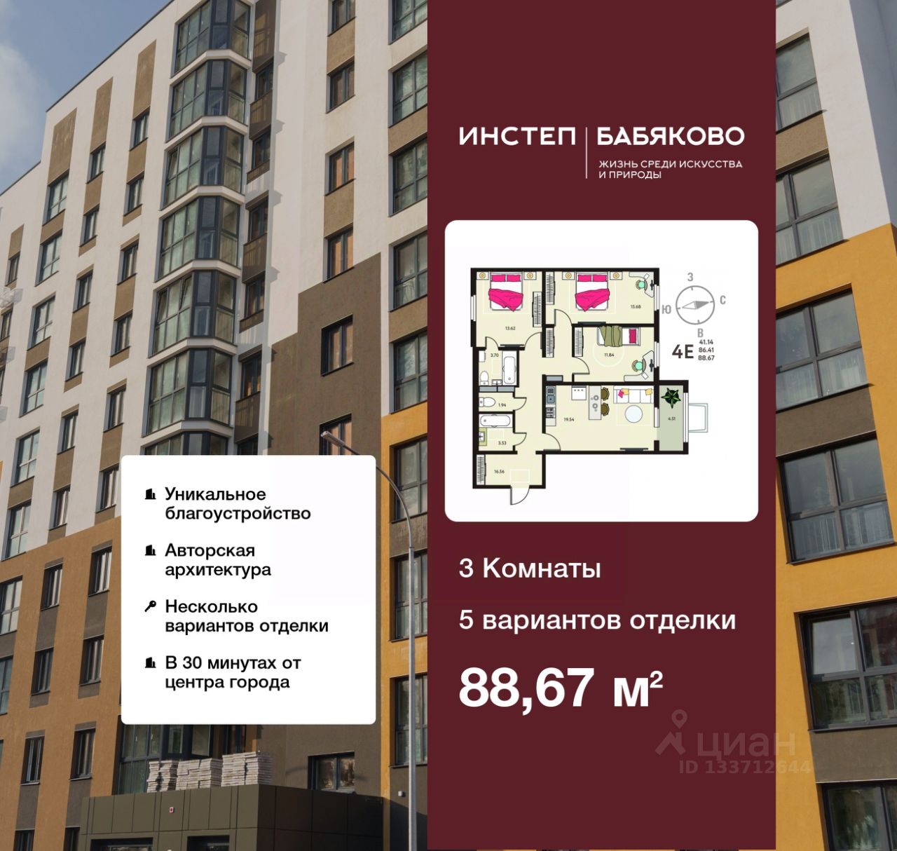 3-комн. квартира в ЖК "Инстеп. Бабяково" на 1 этаже. Квартира без отделки, после получения ключей можно делать ремонт. Общая площадь: 88.67 кв.м., жилая: 41.14 кв.м., площадь просторной кухни-столовой: 19.54 кв.м. Квартира - распашонка, без проходных комнат, окна выходят на paзные стороны дома. В квартире один балкон, один совмещенный и один раздельный санузел. Высота потолков 2.64 м.