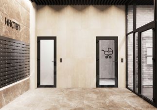 Вход в подъезды с уровня земли. Улучшенная отделка подъездов и межквартирных коридоров по дизайн-проекту. Установлены лифты Метеор (экс-ОТIS) с индивидуальным дизайном. В каждом подъезде на первом этаже расположены колясочные и санузлы.