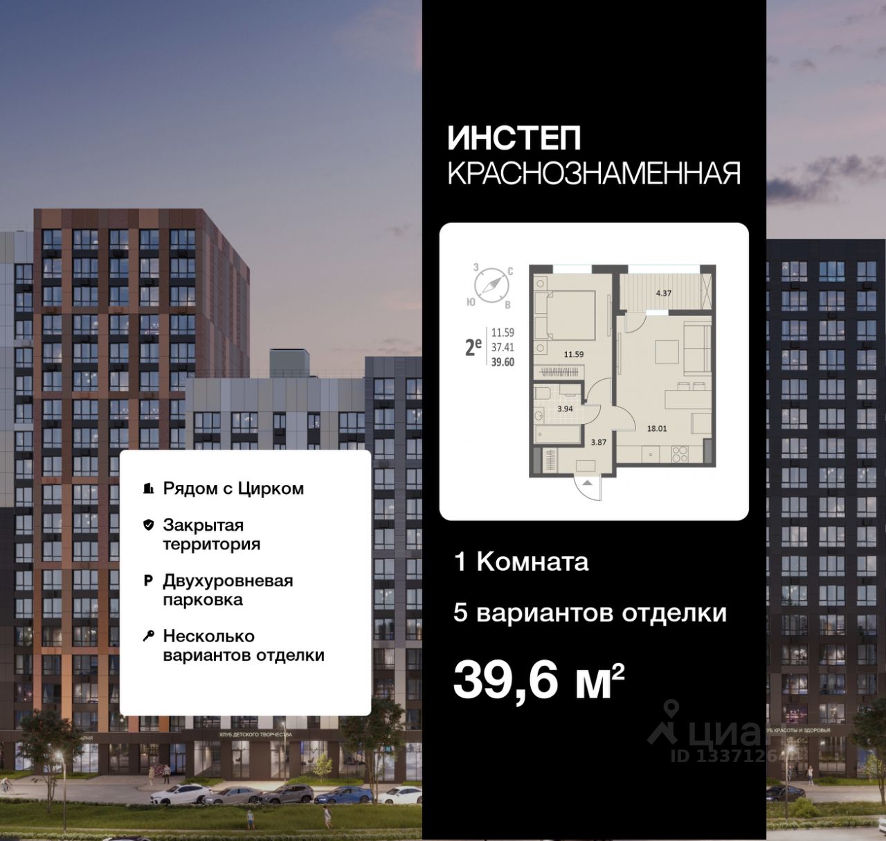 1-комн. квартира в ЖК "Инстеп. Краснознаменная" на 4 этаже. Квартира без отделки, новый собственник может сделать ремонт по своему проекту. Общая площадь: 39.6 кв.м., жилая: 11.59 кв.м., площадь просторной кухни-столовой: 18.01 кв.м. Все окна выходят на одну сторону. В квартире одна лоджия, один совмещенный санузел. Высота потолков 2.64 м.