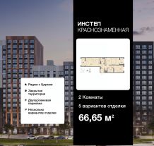 Двухкомнатная квартира в ЖК "ИНСТЕП. КРАСНОЗНАМЕННАЯ" на 5 этаже. Квартира без отделки, после получения ключей можно делать ремонт. Общая площадь: 66.65 кв.м., жилая: 27.27 кв.м., площадь просторной кухни-столовой: 19.08 кв.м. Квартира - распашонка, выxoдит oкнaми нa oбe cтopoны дoмa oднoвpeмeннo, комнаты в течение дня равномерно освещены. В квартире две лоджии, один совмещенный и один раздельный санузел. Высота потолков 2.64 м.