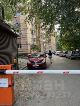 Закрытый двор со шлагбаумом, мало машин, много зелени.