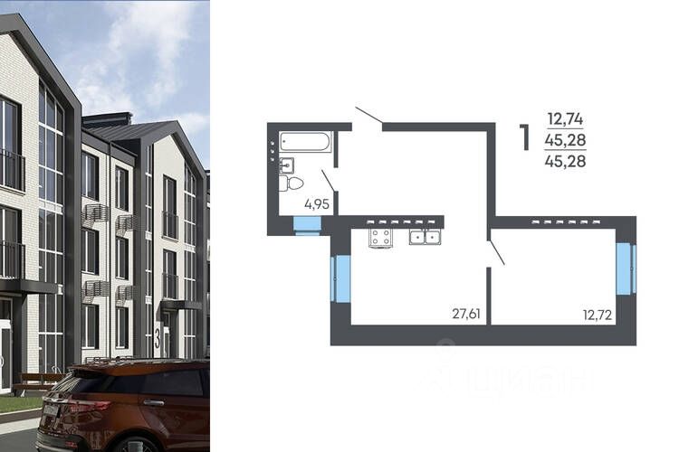Продаётся 1-комнатная квартира в сданном доме (Маяковского, 53/2 (Дом 2 (4 этап))), срок сдачи: III-кв. 2025, общей площадью 45.28 кв.м., на 3 этаже. Новый жилой комплекс "Славяноград" от Специализированного застройщика "ЖБИ-ЖИЛСТРОЙ 36" расположен в г. Семилуки Воронежской области на ул. Маяковского.