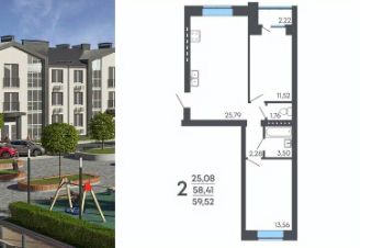 Продаётся 2-комнатная квартира в сданном доме (Маяковского, 53/3 (Дом 3 (4 этап))), срок сдачи: III-кв. 2025, общей площадью 59.52 кв.м., на 3 этаже. Новый жилой комплекс "Славяноград" от Специализированного застройщика "ЖБИ-ЖИЛСТРОЙ 36" расположен в г. Семилуки Воронежской области на ул. Маяковского.