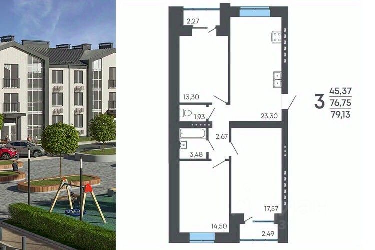 Продаётся 3-комнатная квартира в сданном доме (Маяковского, 53/3 (Дом 3 (4 этап))), срок сдачи: III-кв. 2025, общей площадью 79.13 кв.м., на 1 этаже. Новый жилой комплекс "Славяноград" от Специализированного застройщика "ЖБИ-ЖИЛСТРОЙ 36" расположен в г. Семилуки Воронежской области на ул. Маяковского.