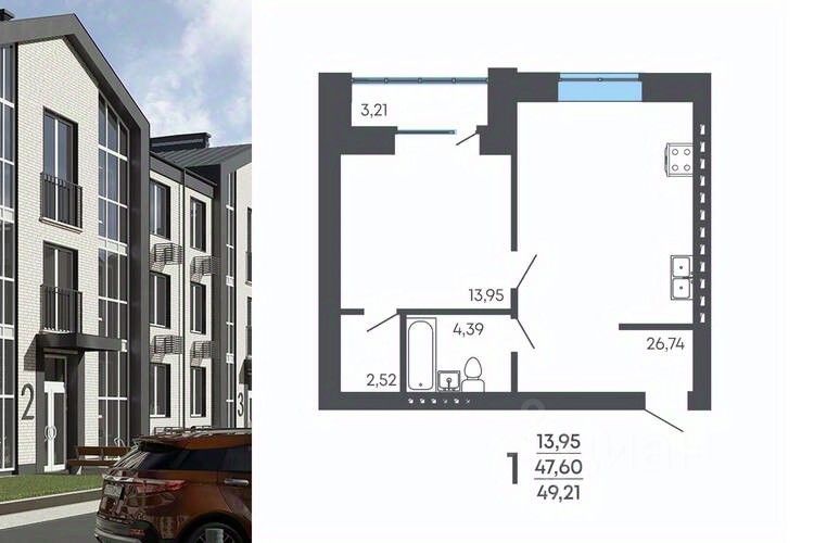 Продаётся 1-комнатная квартира в сданном доме (Маяковского, 53/4 (Дом 4 (4 этап))), срок сдачи: III-кв. 2025, общей площадью 49.21 кв.м., на 3 этаже. Новый жилой комплекс "Славяноград" от Специализированного застройщика "ЖБИ-ЖИЛСТРОЙ 36" расположен в г. Семилуки Воронежской области на ул. Маяковского.