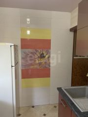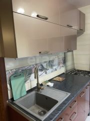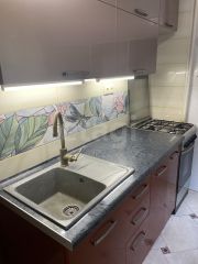 В кухне выполнен индивидуальный дизайнерский ремонт. Все стены в белой керамической плитке, на одной стене итальянское панно от пола до потолка, на рабочей стене горизонтальное панно авторской работы.