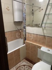 Санузел полностью облицован плиткой, включая напольное панно ручной работы. Краны и трубы скрыты в стене, а все инженерные системы закрыты экранами, что придает помещению эстетичный и лаконичный вид.