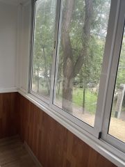 Лоджия застеклена алюминиевыми раздвижными конструкциями, что удобно для проветривания.