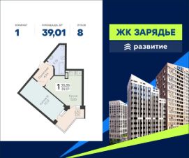 В продаже квартира площадью 39.01 кв. м с черновой отделкой. Квартира расположена на 8 этаже 18 этажного дома, в новом микрорайоне комфорт-класса "Зарядье" (Девелопер - ГК "Развитие").