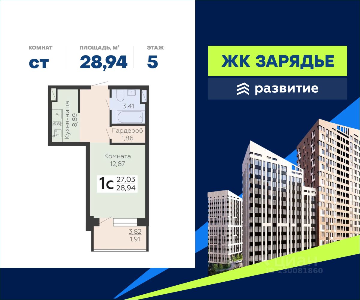 В продаже квартира площадью 28.94 кв. м с черновой отделкой. Квартира расположена на 5 этаже 18 этажного дома, в новом микрорайоне комфорт-класса "Зарядье" (Девелопер - ГК "Развитие").
