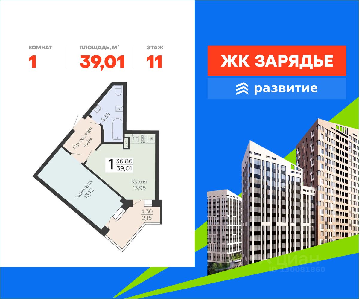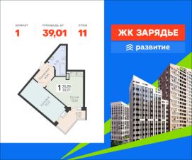 В продаже квартира площадью 39.01 кв. м с черновой отделкой. Квартира расположена на 11 этаже 18 этажного дома, в новом микрорайоне комфорт-класса "Зарядье" (Девелопер - ГК "Развитие").