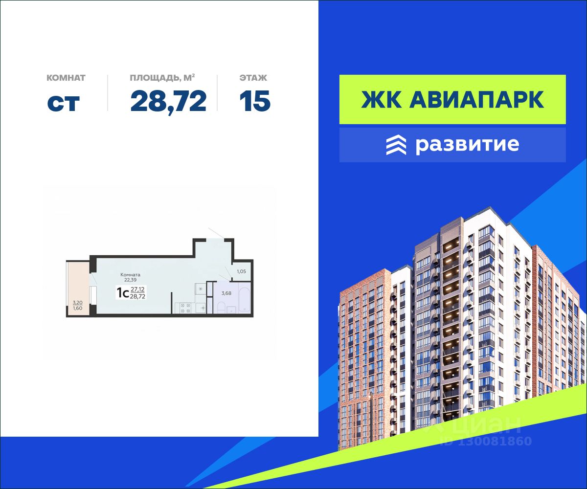 В продаже квартира площадью 28.72 кв. м с черновой отделкой. Квартира расположена на 15 этаже 18 этажного дома, в новом жилом квартале "Авиапарк".