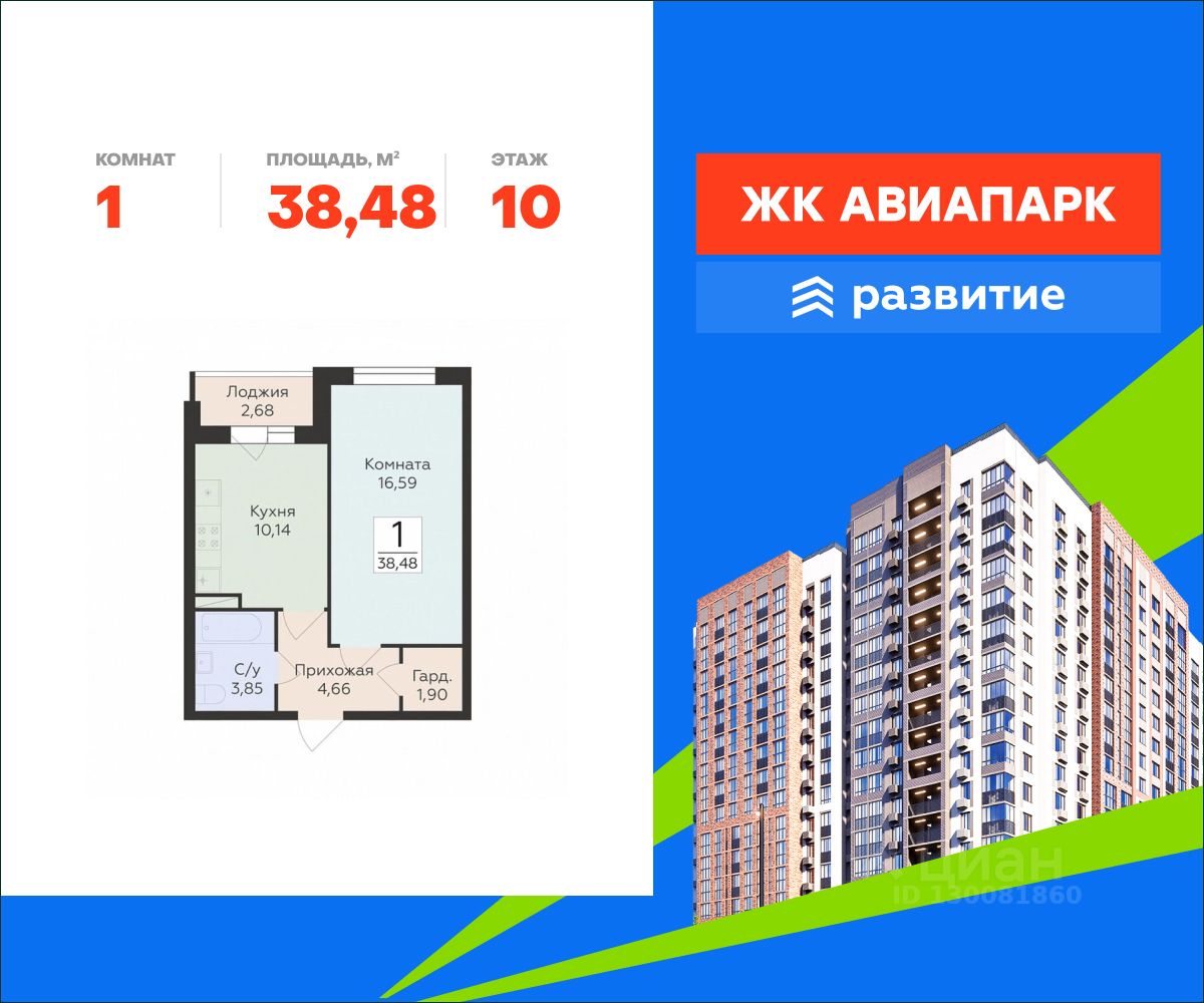 В продаже квартира площадью 38.48 кв. м с отделкой. Квартира расположена на 10 этаже 18 этажного дома, в новом жилом квартале "Авиапарк".