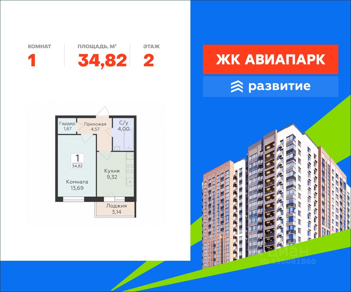 В продаже квартира площадью 34.82 кв. м с отделкой. Квартира расположена на 2 этаже 16 этажного дома, в новом жилом квартале "Авиапарк".