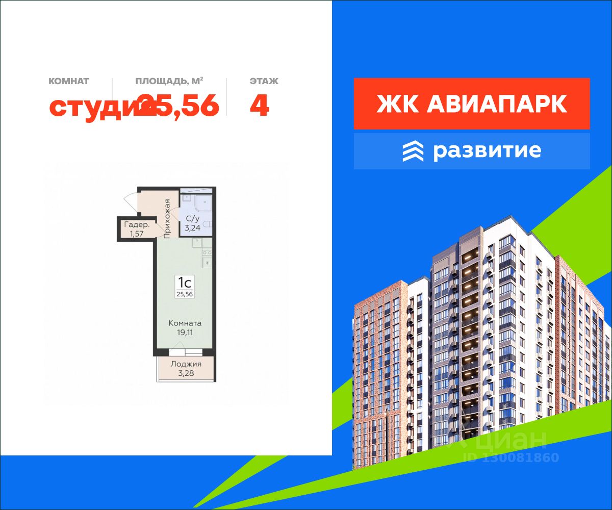 В продаже квартира площадью 25.56 кв. м с отделкой. Квартира расположена на 4 этаже 16 этажного дома, в новом жилом квартале "Авиапарк".