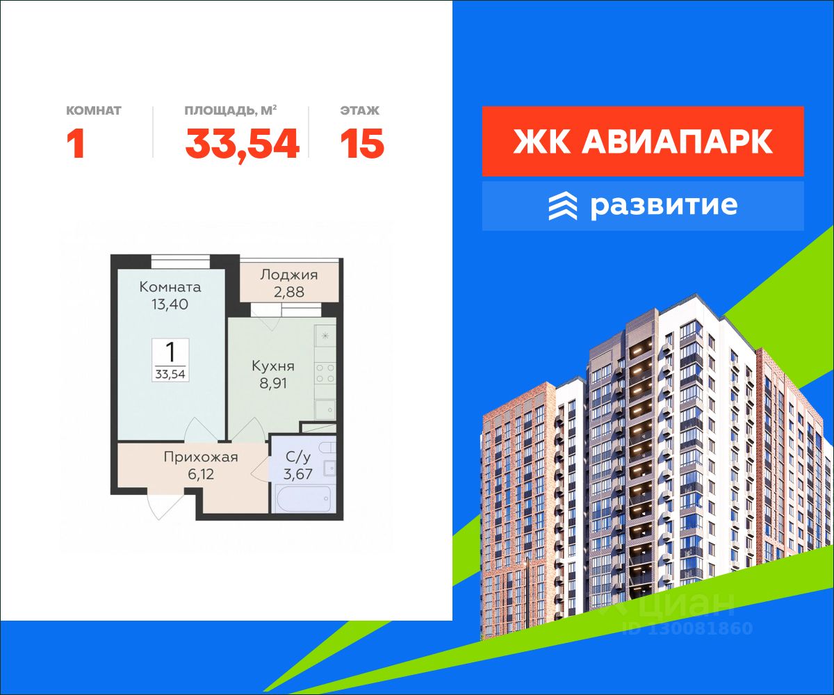 В продаже квартира площадью 33.54 кв. м с отделкой. Квартира расположена на 15 этаже 16 этажного дома, в новом жилом квартале "Авиапарк".