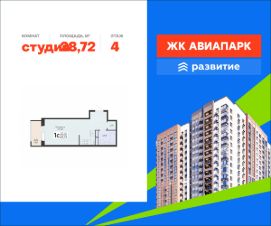 В продаже квартира площадью 28.72 кв. м с черновой отделкой. Квартира расположена на 4 этаже 18 этажного дома, в новом жилом квартале "Авиапарк".