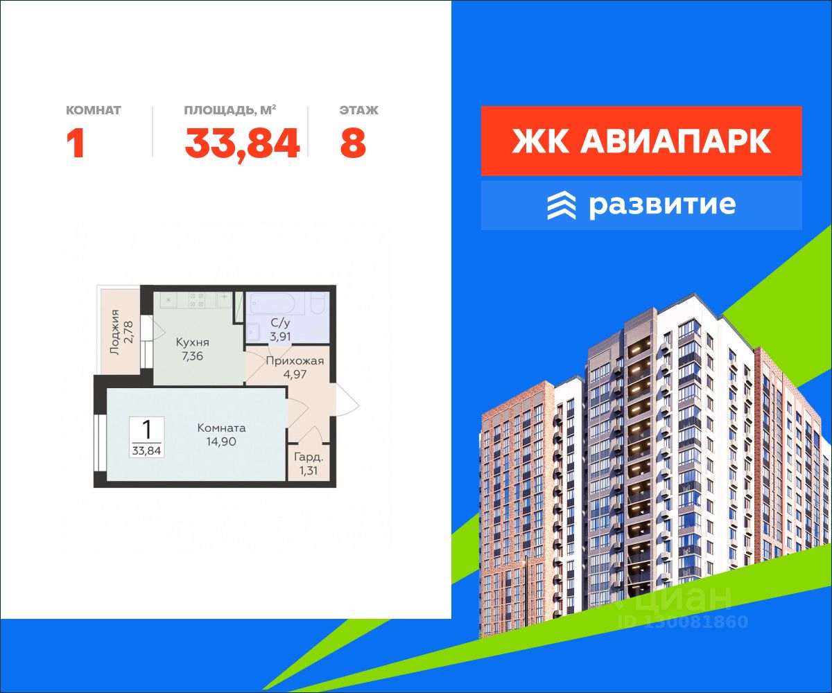 В продаже квартира площадью 33.84 кв. м с отделкой. Квартира расположена на 8 этаже 18 этажного дома, в новом жилом квартале "Авиапарк".