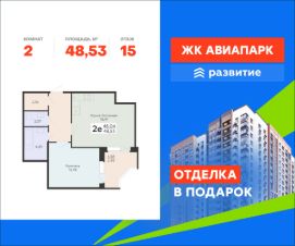 В продаже квартира площадью 48.53 кв. м с черновой отделкой. Квартира расположена на 15 этаже 18 этажного дома, в новом жилом квартале "Авиапарк".