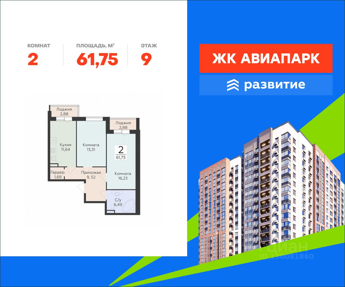 В продаже квартира площадью 61.75 кв. м с черновой отделкой. Квартира расположена на 9 этаже 10 этажного дома, в новом жилом квартале "Авиапарк".