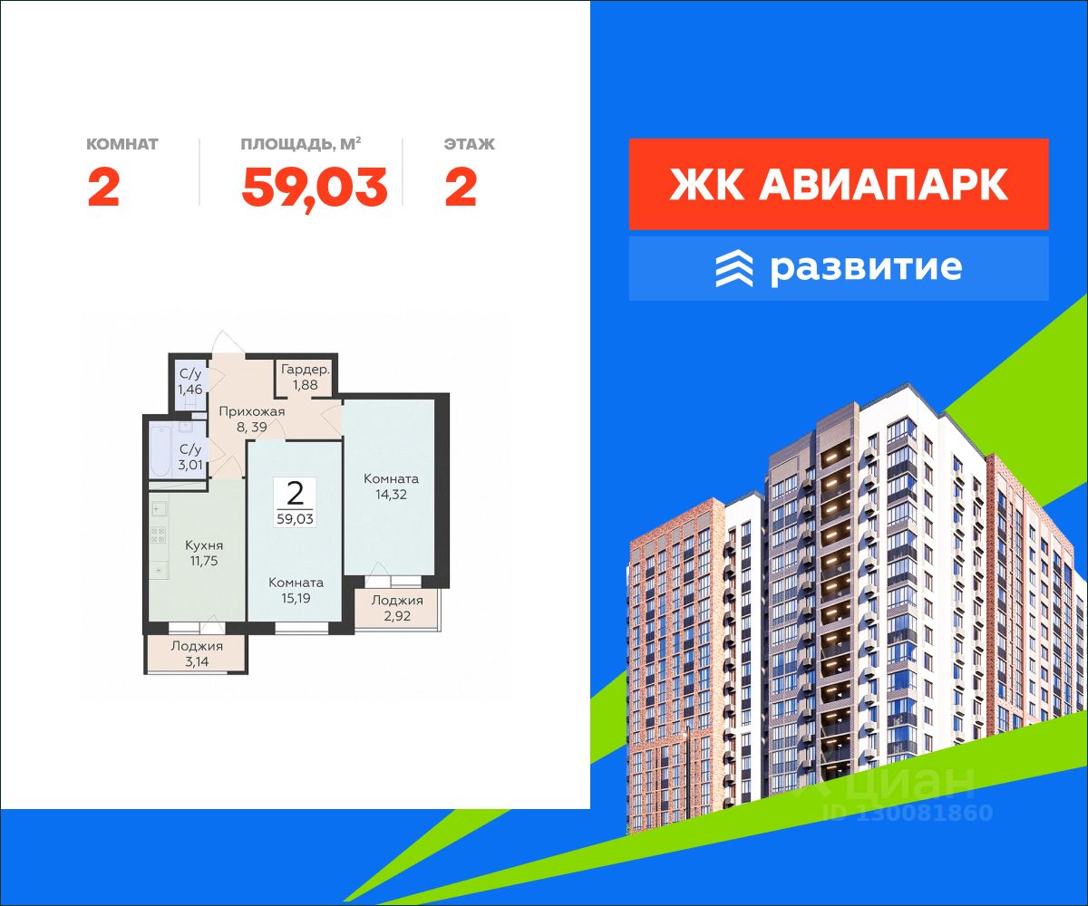 В продаже квартира площадью 59.03 кв. м с черновой отделкой. Квартира расположена на 2 этаже 10 этажного дома, в новом жилом квартале "Авиапарк".