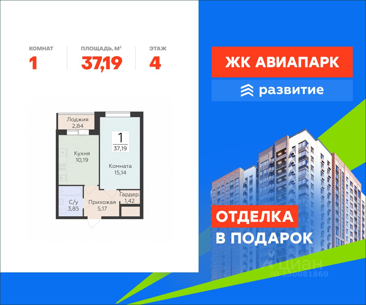 В продаже квартира площадью 37.19 кв. м с черновой отделкой. Квартира расположена на 4 этаже 10 этажного дома, в новом жилом квартале "Авиапарк".