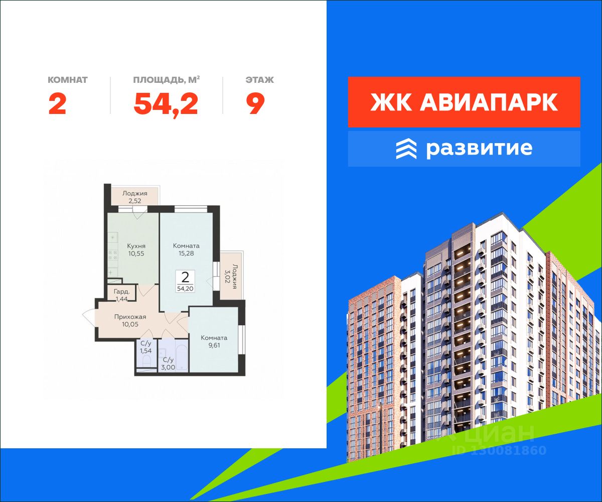 В продаже квартира площадью 54.20 кв. м с черновой отделкой. Квартира расположена на 9 этаже 18 этажного дома, в новом жилом квартале "Авиапарк".