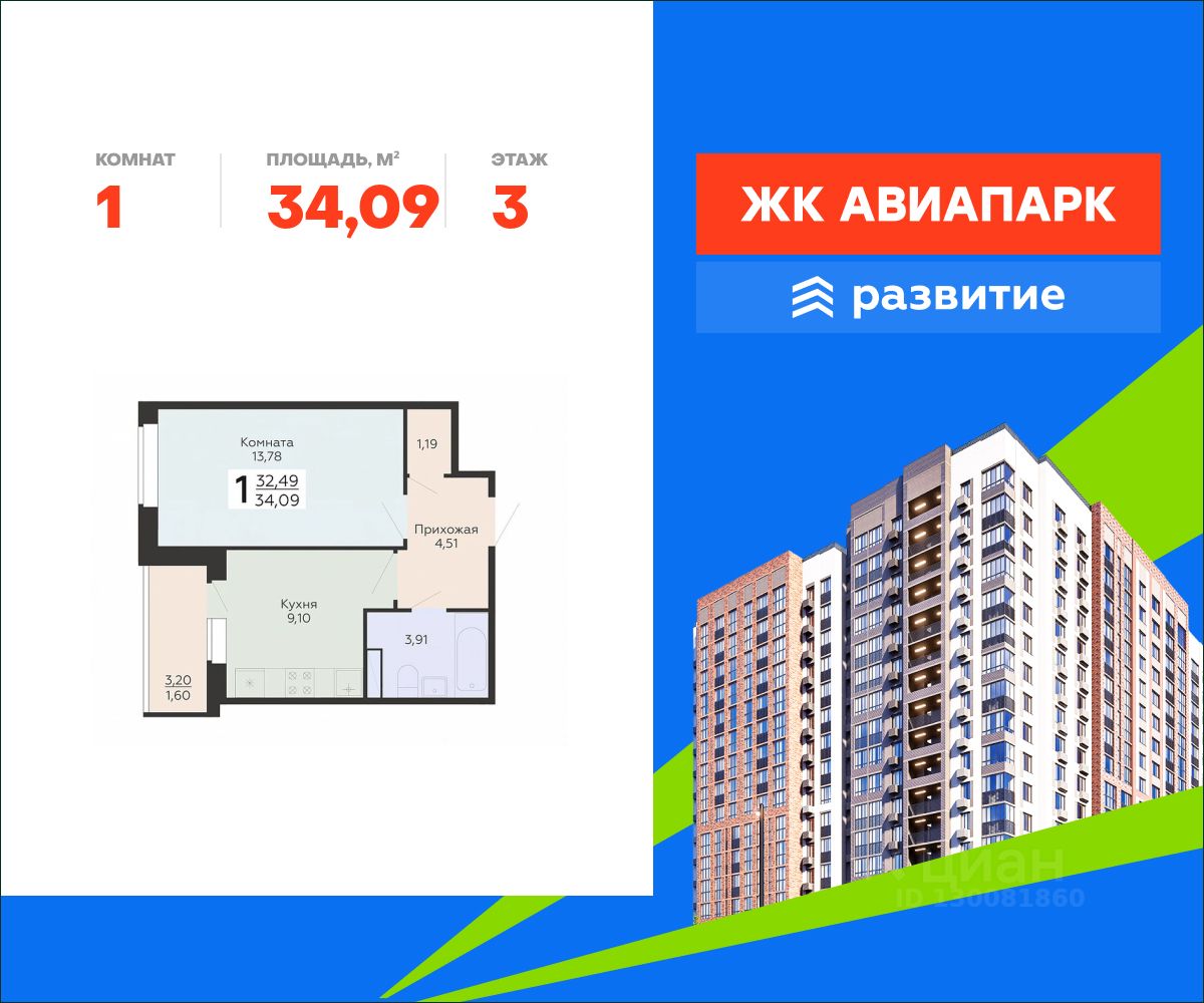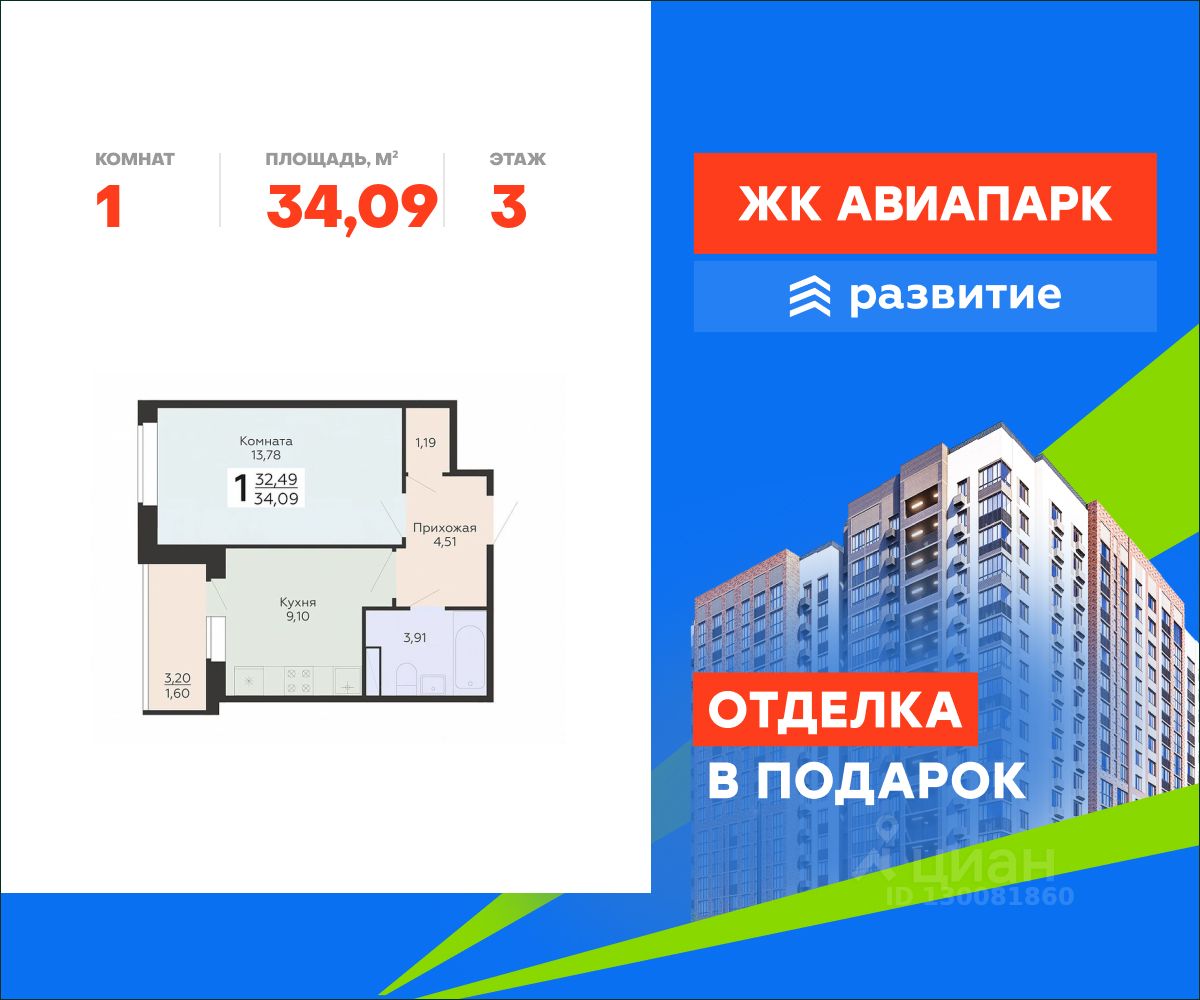 В продаже квартира площадью 34.09 кв. м с черновой отделкой. Квартира расположена на 3 этаже 18 этажного дома, в новом жилом квартале "Авиапарк".