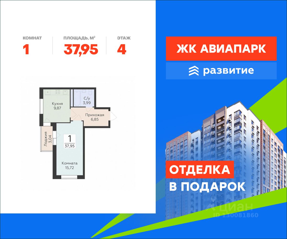 В продаже квартира площадью 37.95 кв. м с черновой отделкой. Квартира расположена на 4 этаже 10 этажного дома, в новом жилом квартале "Авиапарк".