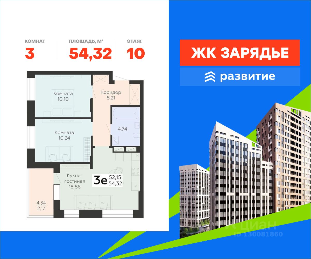 В продаже квартира площадью 54.32 кв. м с черновой отделкой. Квартира расположена на 10 этаже 25 этажного дома, в новом микрорайоне комфорт-класса "Зарядье" (Девелопер - ГК "Развитие").