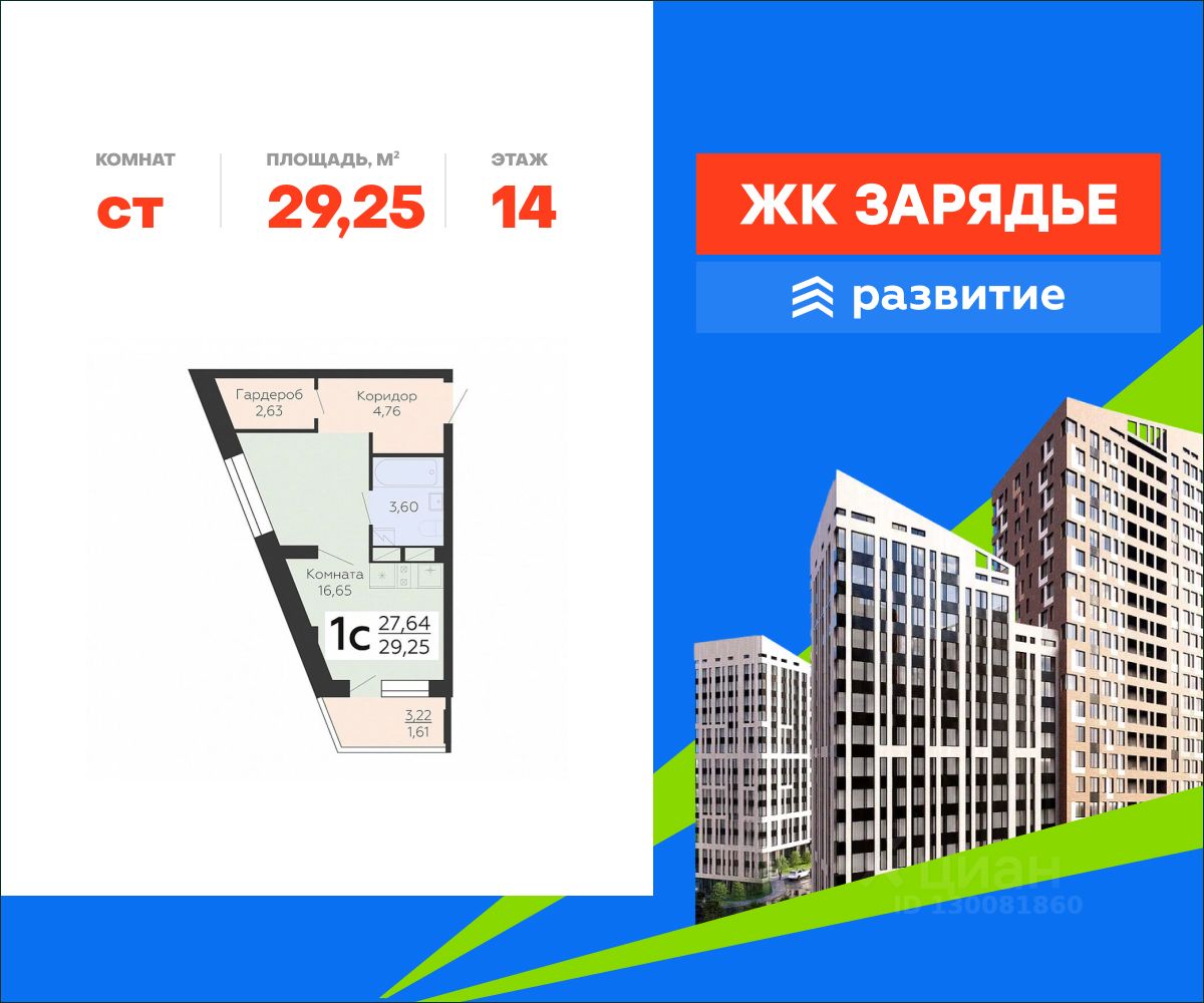 В продаже квартира площадью 29.25 кв. м с черновой отделкой. Квартира расположена на 14 этаже 23 этажного дома, в новом микрорайоне комфорт-класса "Зарядье" (Девелопер - федеральный застройщик ГК "Развитие").