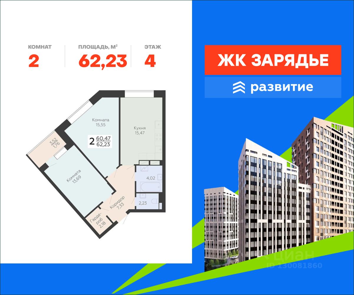 В продаже квартира площадью 62.23 кв. м с черновой отделкой. Квартира расположена на 4 этаже 13 этажного дома, в новом микрорайоне комфорт-класса "Зарядье" (Девелопер - ГК "Развитие").
