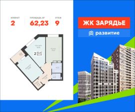 В продаже квартира площадью 62.23 кв. м с черновой отделкой. Квартира расположена на 9 этаже 13 этажного дома, в новом микрорайоне комфорт-класса "Зарядье" (Девелопер - ГК "Развитие").