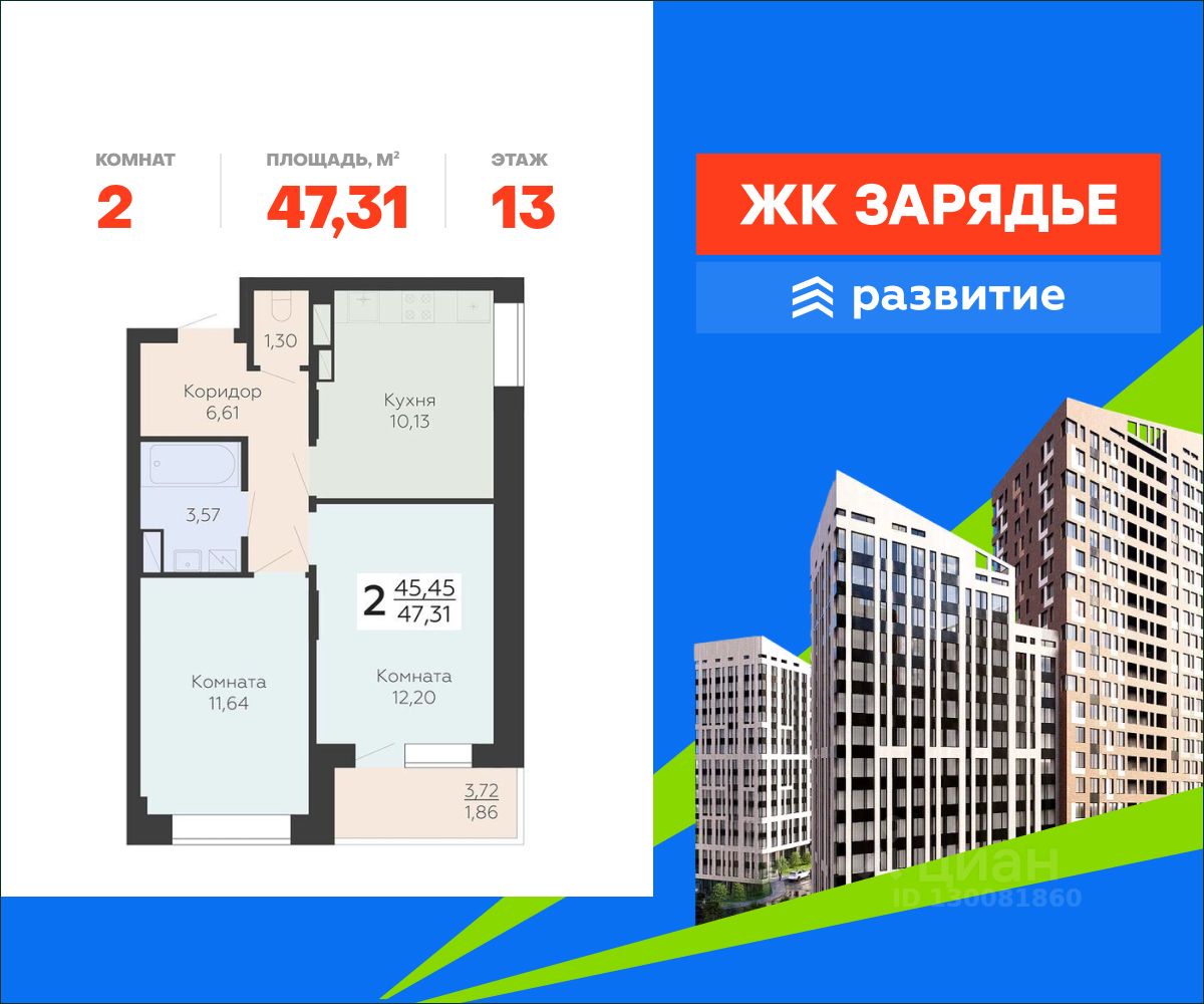 В продаже квартира площадью 47.31 кв. м с черновой отделкой. Квартира расположена на 13 этаже 13 этажного дома, в новом микрорайоне комфорт-класса "Зарядье" (Девелопер - федеральный застройщик ГК "Развитие").