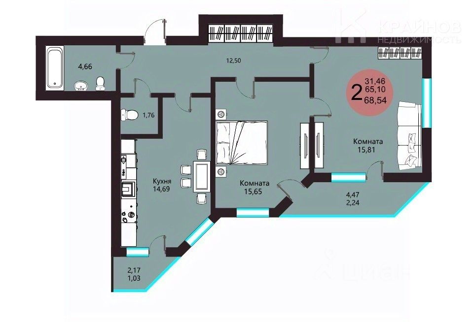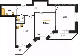 Гостиная - 15,81 кв.м, в комнате 2 окна, что делает её ещё более просторной и светлой. Из комнаты выход на вторую лоджию. Эта комната станет отличной зоной отдыха всей семьи, в которой также можно оборудовать и спальное место.