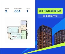 В продаже квартира площадью 55.10 кв. м с черновой отделкой. Квартира расположена на 1 этаже 19 этажного дома, в жилом комплексе "Молодежный" (застройщик - ГК "Развитие").