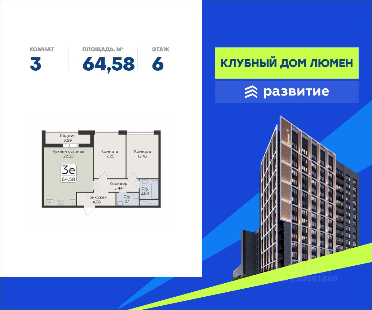Продается трехкомнатная квартира 49 в новостройке Клубный дом "Люмен" по адресу Воронежская область, Воронеж, пр-т Труда, д. 117. Общая площадь квартиры - 64.58 кв. м., этаж 6 из 17, секция 1. Тип проекта, по которому построен дом - монолит, компания-застройщик - ООО "ГК "Развитие". Стоимость квартиры - 8944330 Р. Срок сдачи - 4 квартал 2027. Более подробная информация по телефону.