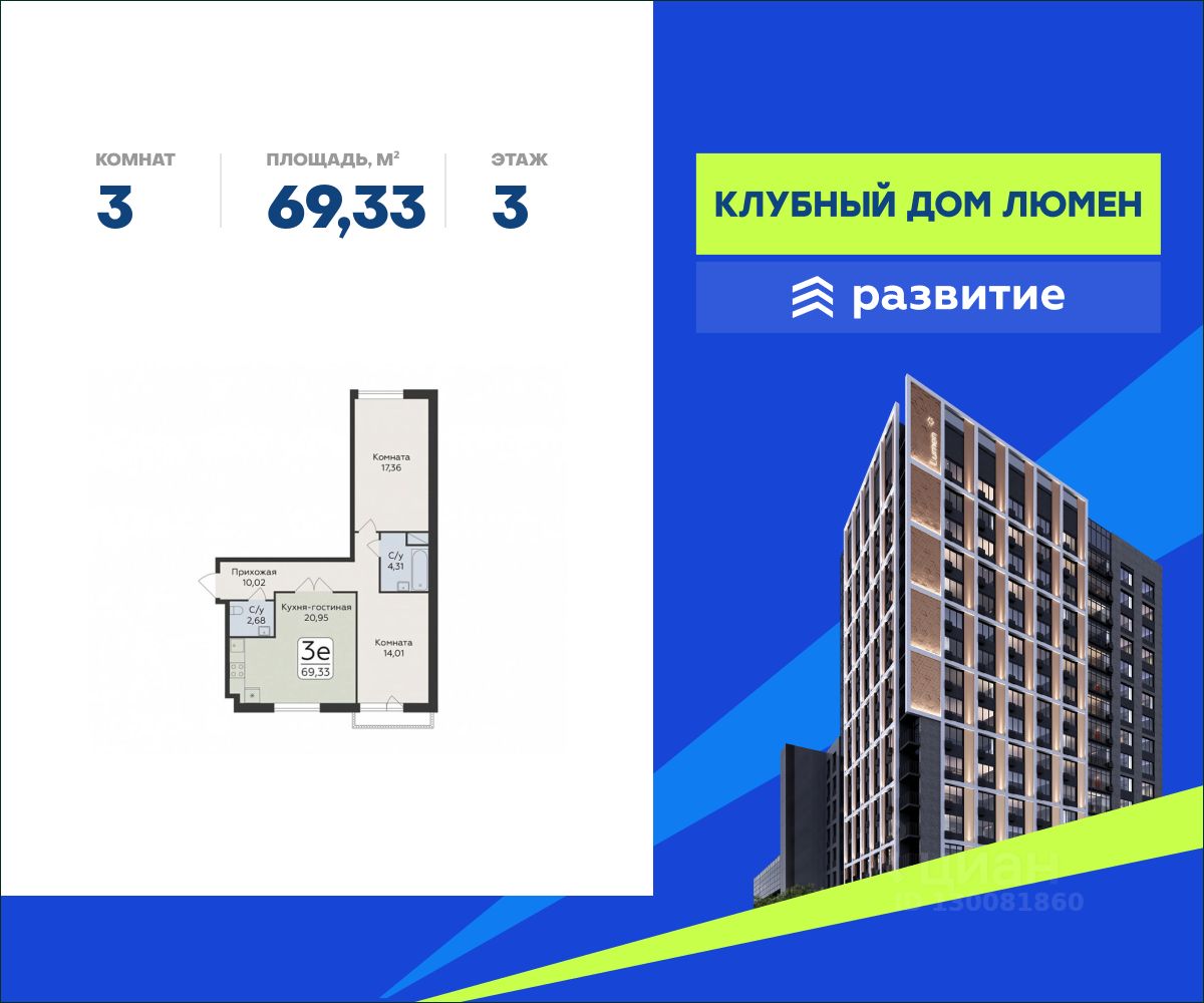 Продается трехкомнатная квартира 20 в новостройке Клубный дом "Люмен" по адресу Воронежская область, Воронеж, пр-т Труда, д. 117. Общая площадь квартиры - 69.33 кв. м., этаж 3 из 17, секция 1. Тип проекта, по которому построен дом - монолит, компания-застройщик - ООО "ГК "Развитие". Стоимость квартиры - 9116895 Р. Срок сдачи - 4 квартал 2027. Более подробная информация по телефону.