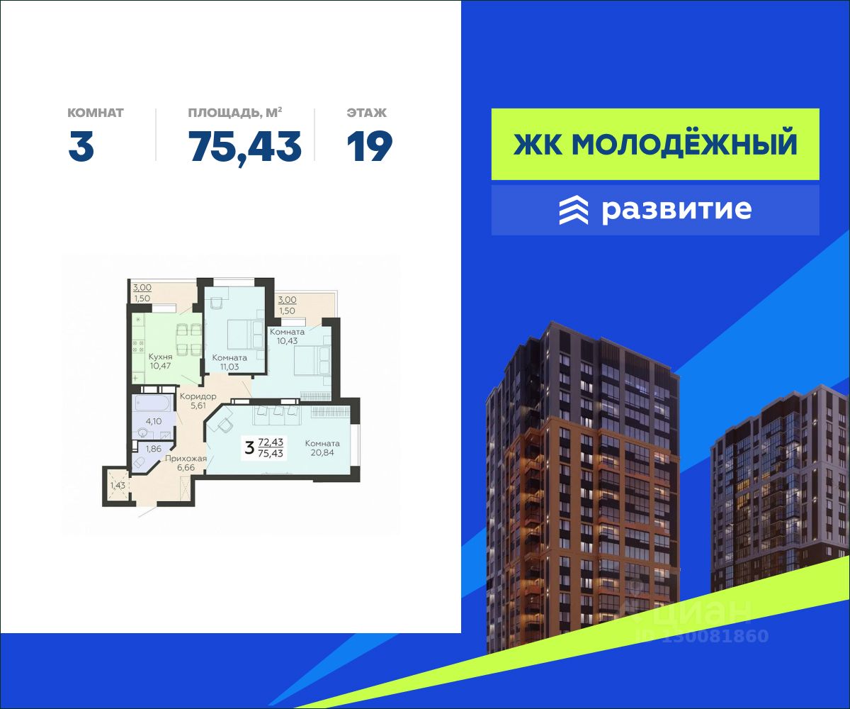 В продаже квартира площадью 75.43 кв. м с черновой отделкой. Квартира расположена на 19 этаже 19 этажного дома, в жилом комплексе "Молодежный" (застройщик - ГК "Развитие").
