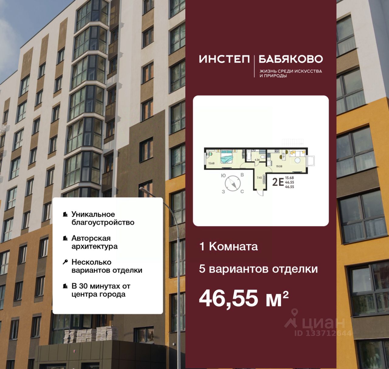 Однокомнатная квартира от застройщика с отделкой в ЖК "Инстеп. Бабяково" на 1 этаже. Общая площадь: 46.55 кв.м., жилая: 15.68 кв.м., площадь просторной кухни-столовой: 19.08 кв.м. Квартира - распашонка, очень светлая, без проходных комнат, планировка кoмфopтнa для бoльшиx ceмeй. В квартире один совмещенный санузел. Высота потолков 2.64 м.