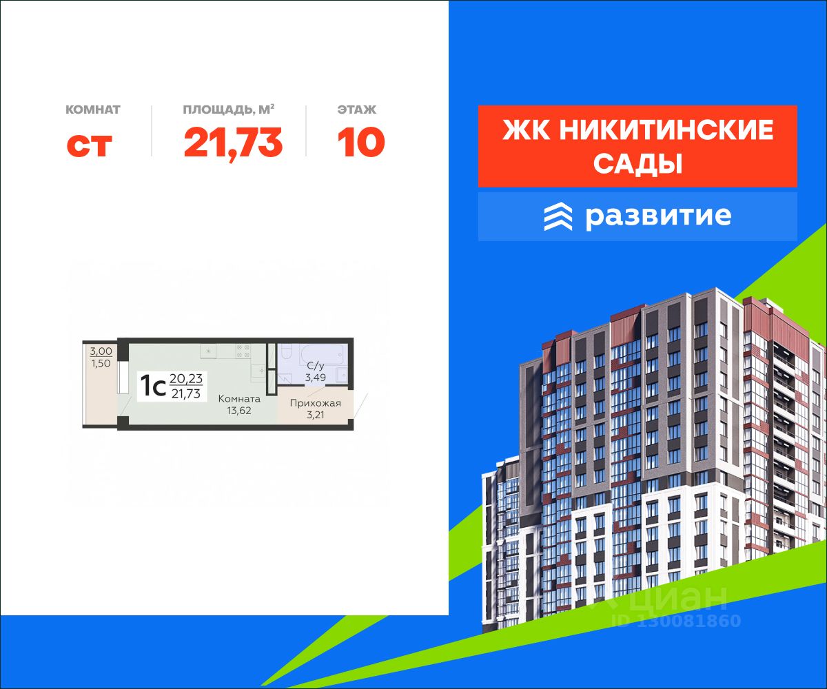 В продаже квартира площадью 21.73 кв. м с черновой отделкой. Квартира расположена на 10 этаже 20 этажного дома, в жилом комплексе комфорт-класса "Никитинские сады".