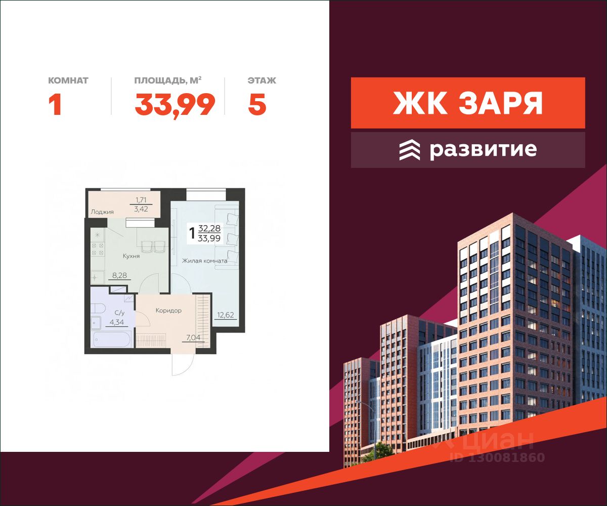 В продаже квартира площадью 33.99 кв. м с черновой отделкой. Квартира расположена на 5 этаже 14 этажного дома, в новом жилом комплексе "Заря" от федерального застройщика "Развитие".