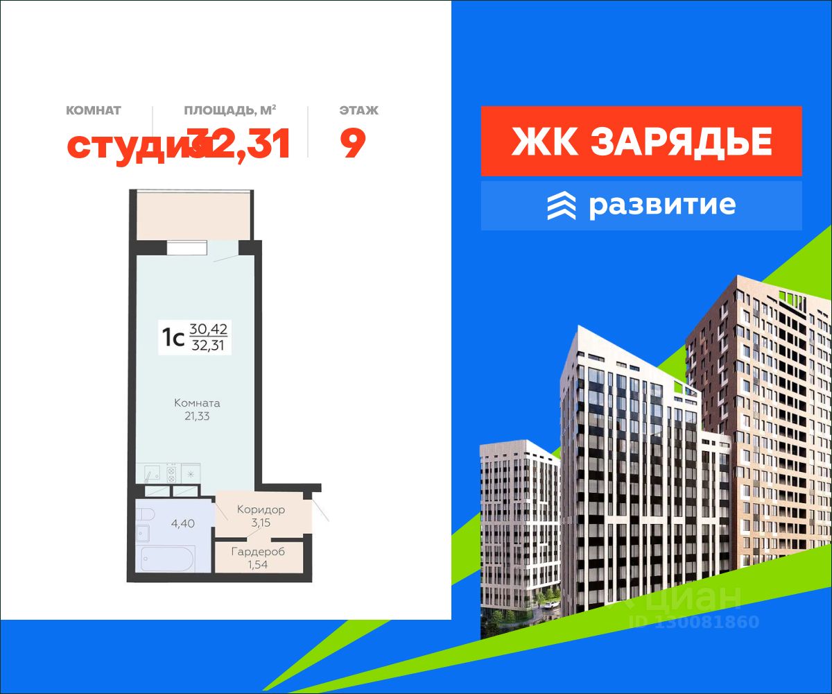 В продаже квартира площадью 32.31 кв. м с черновой отделкой. Квартира расположена на 9 этаже 13 этажного дома, в новом микрорайоне комфорт-класса "Зарядье" (Девелопер - ГК "Развитие").