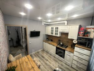 Общая площадь - 63,3 кв.м., спальни - 11,5 и 10,5 кв.м, гостиная 17 кв.м, вместительная кухня - 9 кв.м. Новый кухонный гарнитур останется новым хозяевам.