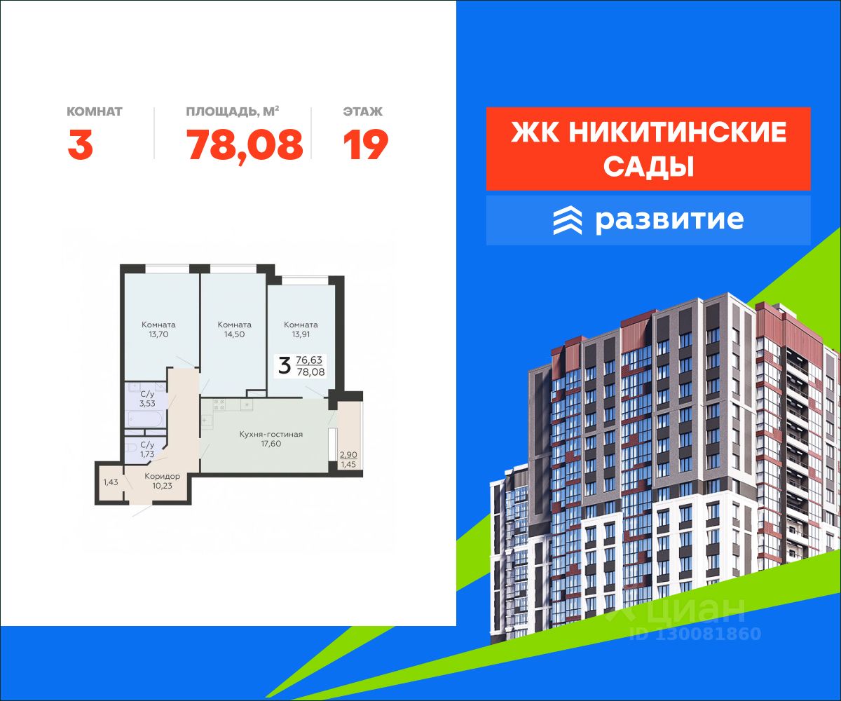 В продаже квартира площадью 78.08 кв. м с отделкой. Квартира расположена на 19 этаже 20 этажного дома, в жилом комплексе комфорт-класса "Никитинские сады".