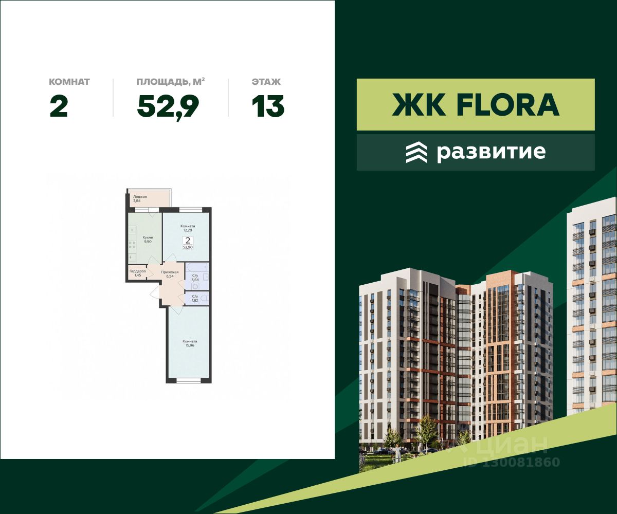 В продаже квартира площадью 52.90 кв. м с черновой отделкой. Квартира расположена на 13 этаже 17 этажного дома, в жилом комплексе комфорт-класса FLORA ("Флора").