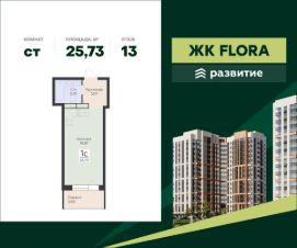 В продаже квартира площадью 25.73 кв. м с черновой отделкой. Квартира расположена на 13 этаже 15 этажного дома, в жилом комплексе комфорт-класса FLORA ("Флора").